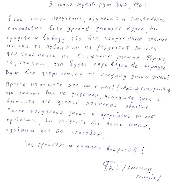 К тому же, я беру все риски на себя. И предоставляю Вам личную гарантию возврата денег, в случае если информация, полученная Вами из курса Вас по каким-либо причинам не устроит.